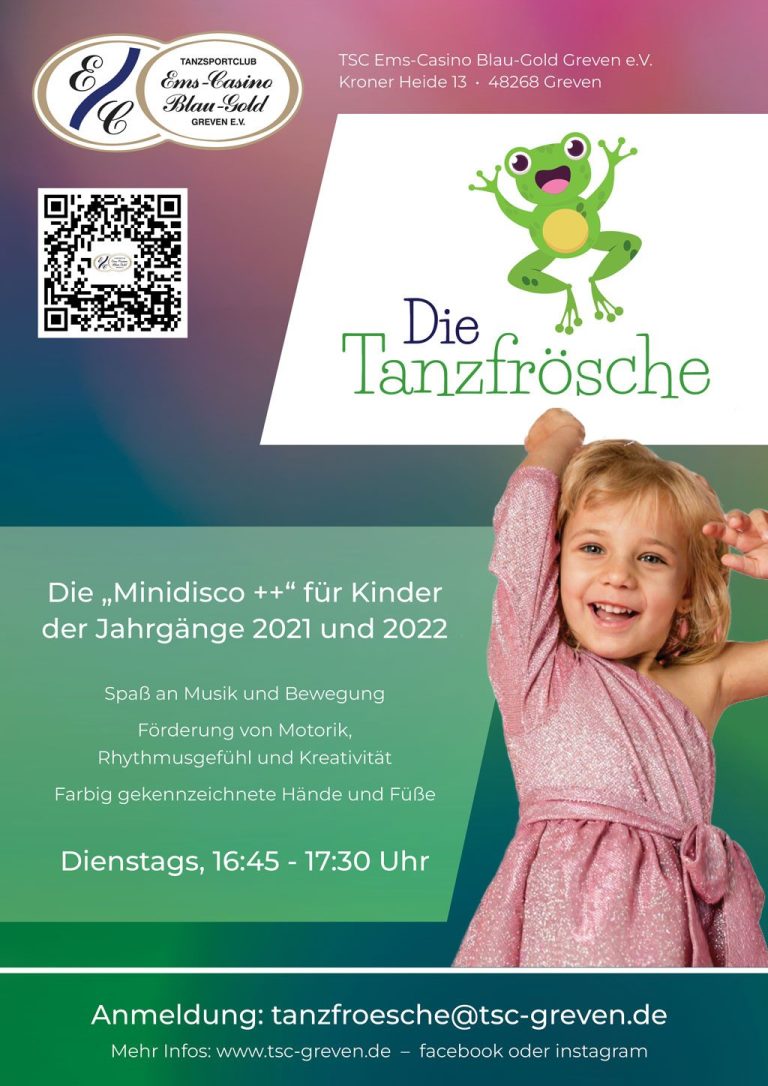 Hinweis: Es gibt eine Warteliste. Melden Sie sich daher bitte per Mail bei der Gruppenleiterin Leona Guth (tanzfroesche@tsc-greven.de) unter Angabe des Namens und Geburtsdatums Ihres Kindes an. Bitte ziehen Sie Ihren Kindern zum Schnuppern gut stoppende Fußbekleidung an (Stoppersocken oder Schläppchen), denn unser Tanzparkett ist relativ glatt!